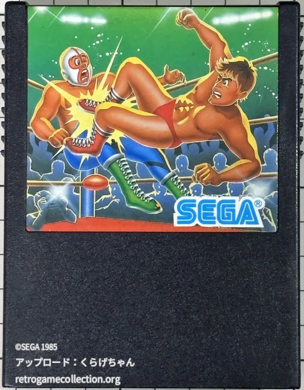 SG-1000用ソフト「チャンピオンプロレス」は、1985年3月1日にセガから発売されたプロレス対戦アクションゲームです。プレイヤーは複数の架空のプロレスラーから一人を選び、コンピュータと1対1で対戦します。ゲームシステムは、方向ボタンでの移動と、ボタン操作によるパンチ、キックといった打撃技、相手を掴んで繰り出す投げ技などを用いて、相手の体力を奪っていくものです。最終的にフォール、ギブアップ、リングアウトなどで勝利を目指します。当時の家庭用ゲームとしては、プロレスの基本的なルールやアクションがシンプルに再現されており、SG-1000初期のプロレスゲームとして、そのジャンルの基礎を築いた作品の一つと言えます。