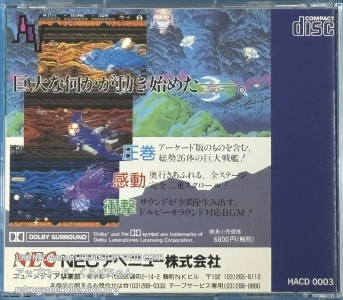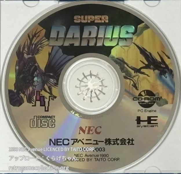 「スーパーダライアス」は、1990年3月16日にNECアベニューから発売されたPCエンジン用横スクロールシューティングゲームです。タイトーが1987年に稼働開始したアーケード版「ダライアス」の移植作品で、アーケード版の最大の特徴である3画面連結筐体はPCエンジン版では再現されていません。プレイヤーは自機シルバーホークを操作し、水棲生物をモチーフとした巨大戦艦ボスを倒しながら進みます。色分けされたパワーカプセルで自機を強化できますが、ミスするとパワーアップの一部が失われます。ステージクリア後には上下への分岐路で次ステージを選択するシステムが特徴で、全26ステージ中7ゾーンをクリアするとエンディングとなります。