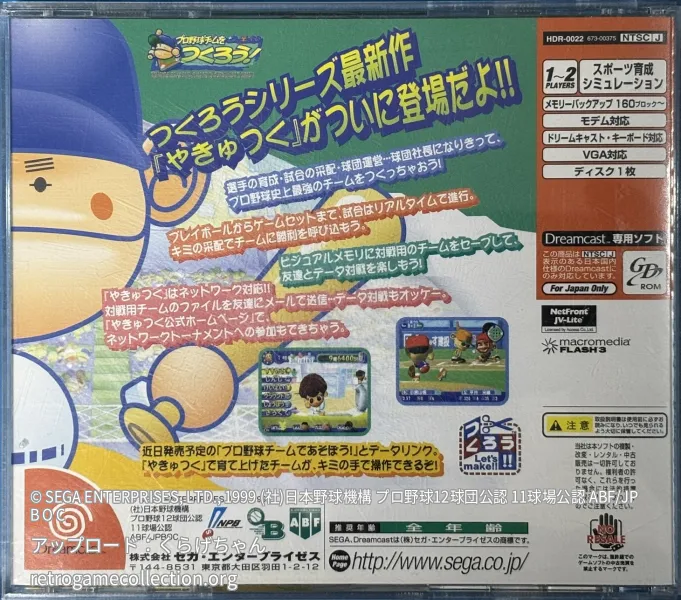 『プロ野球チームをつくろう!』は、1999年8月5日にセガから発売されたドリームキャスト用経営シミュレーションゲームです。本作は「やきゅつく」の略称で親しまれ、シリーズの記念すべき1作目にあたります。日本のプロ野球をテーマとし、実在する12球団から一つを選んで育成し、世界一の球団を作り上げることを目指します。プレイヤーは球団の運営、選手の獲得・育成、監督・コーチの人事を担当しますが、試合中の選手を直接操作することはできません。キャラクターデザインは二頭身となり、10年毎に状態を引き継ぐシステムや、以前廃止された強化アイテムが復活するなど、独自のシステムが特徴です。