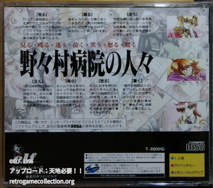 『野々村病院の人々』は、1996年4月26日にエルフよりセガサターン向けに発売された推理物アドベンチャーゲームです。元は1994年にシルキーズから発売されたアダルトゲームの家庭用移植版となります。プレイヤーは私立探偵・海原琢磨呂となり、医療ミスなどの黒い噂が絶えない野々村病院で発生した院長・野々村作治の不審死事件の真相を追います。警察は自殺と断定しますが、琢磨呂は現院長の野々村亜希子からの依頼を受け、病院内に潜む複雑な人間関係や黒い事実を突き止めていくことになります。
